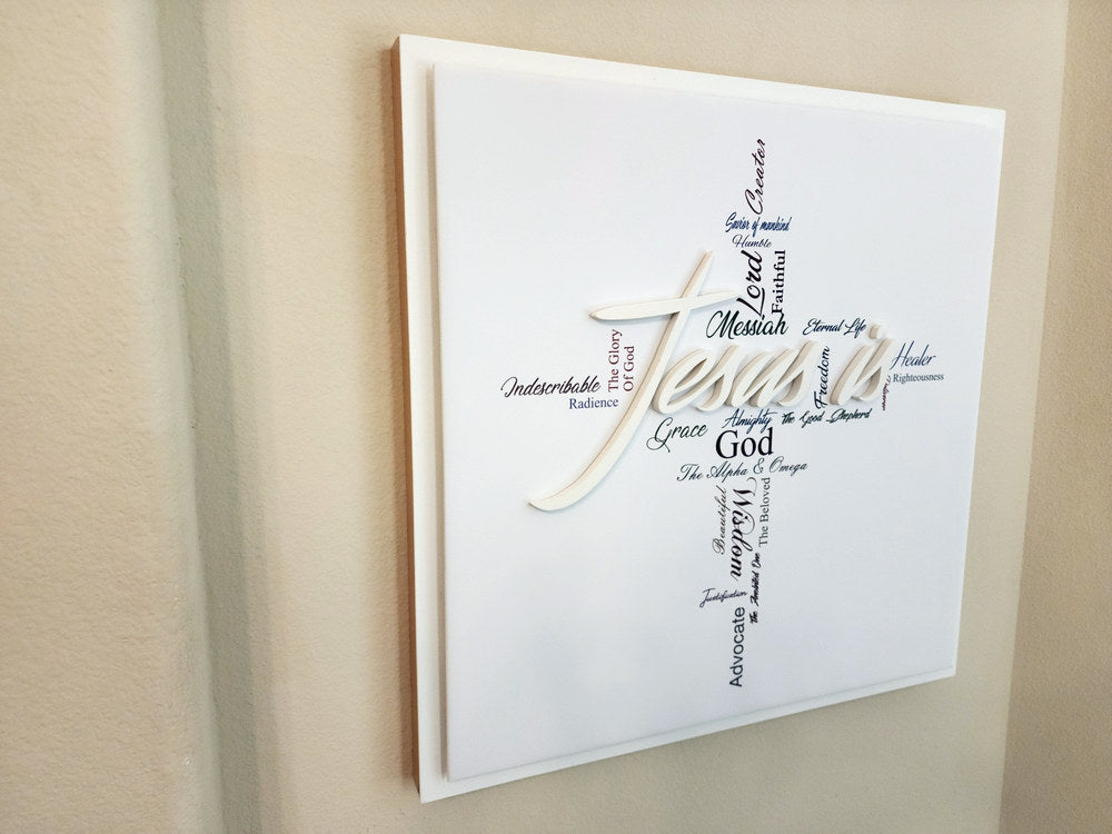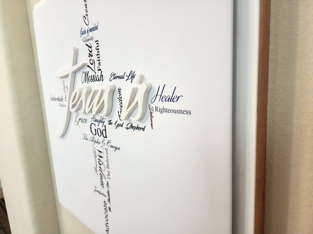 The clean background and wood frame anchor the piece with simplicity, allowing the intricate word arrangement to speak with clarity and power. Both contemplative and celebratory, this artwork invites viewers to meditate on the richness of who Jesus is, offering inspiration, comfort, and a reminder of His boundless grace and majesty.