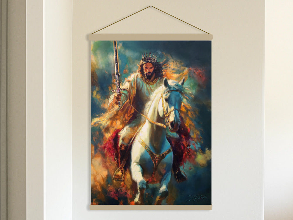 “King of Kings” by Scott Patton is a breathtaking and triumphant portrayal of Jesus returning to earth in glory, inspired by the prophetic imagery of Revelation 19. Clad in radiant white and gold robes, crowned with a regal diadem, Jesus rides a powerful white horse that surges forward through a blaze of heavenly light and color.