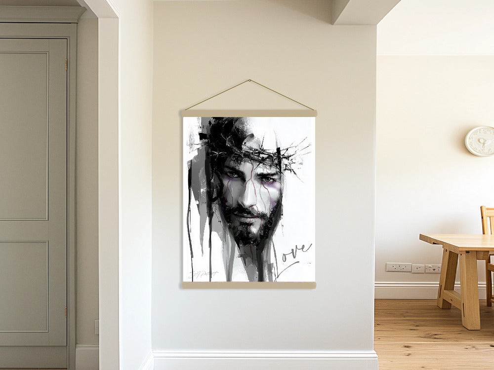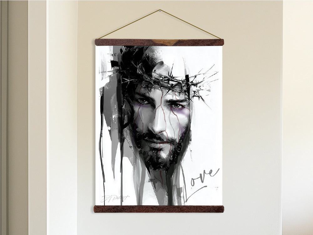 Scott Patton’s painting “Love” is a striking and emotionally charged portrayal of Jesus crowned with thorns, capturing both the agony of His suffering and the depth of His sacrifice. Executed in a bold, modern style, the piece blends realism with abstraction—Jesus’ face emerging with intense clarity against sweeping, textured strokes that dissolve into the background.