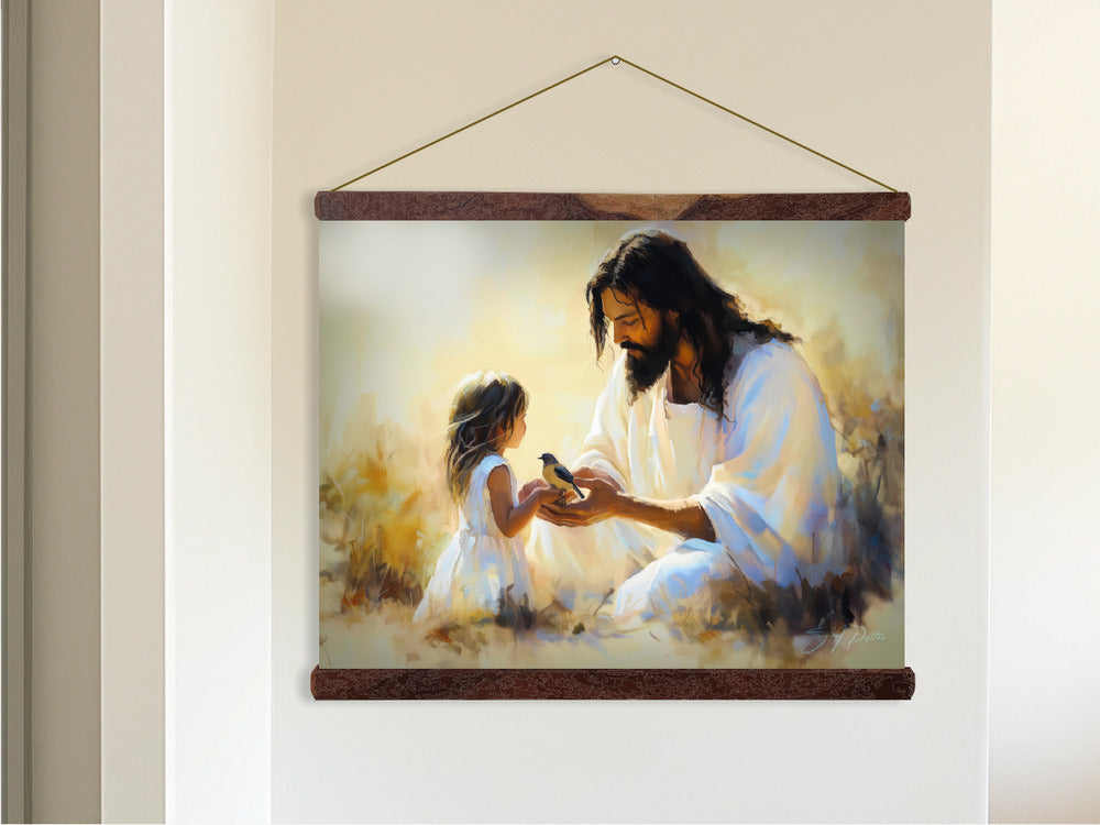 In this tender and heart-stirring work, Jesus is depicted seated beside a small, attentive little girl, gently teaching her about His deep love and care for even the smallest parts of His creation. With warmth in His eyes and His hands holding up the tiny sparrow, the Savior illustrates the profound truth found in Matthew 10:29–31: "Are not two sparrows sold for a penny? Yet not one of them will fall to the ground outside your Father’s care... So don’t be afraid; you are worth more than many sparrows."