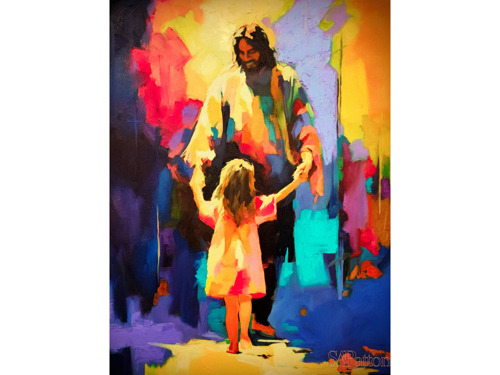 This oil painting by artist Scott Patton beautifully captures a profoundly joyful and sacred moment—Jesus dancing with a little girl as she arrives in Heaven. Rendered in a vibrant impressionist style, the scene radiates warmth and welcome. The brushwork is expressive, with splashy, abstract strokes that create a kaleidoscope of colors—fiery reds, radiant yellows, deep indigos, and electric blues—symbolizing the glory, joy, and overwhelming love of Heaven.