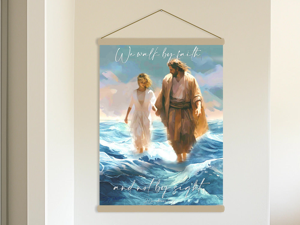 This artwork captures the essence of the Christian journey — not a walk by sight, but a walk by trust in the One who never lets go.