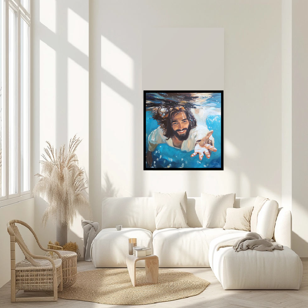 His outstretched hand is not only extended in help, but marked by the faint trace of a cross—symbolizing the price He paid to save. The viewer can almost feel the motion of the water around Him, filled with air bubbles and light, giving the scene a sense of movement and urgency. Yet, amidst the chaos, Jesus remains calm and powerful—completely focused on the one He came to save.
